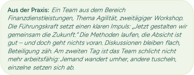 Für das Team beginnt dieser Prozess in diesem Moment erst. Diese zeitliche Asymmetrie erzeugt Reibung – nicht fehlende Bereitschaft. Wird diese Asymmetrie nicht mitgedacht, kann natürliche Verarbeitung leicht als Widerstand gelesen werden. Teams brauchen Raum, um denselben Weg zu gehen.